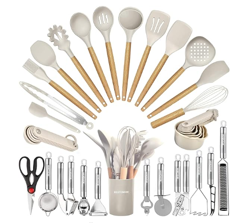 This set includes 35 different utensils, ensuring you have everything required for both basic and complex cooking tasks. The set features:
