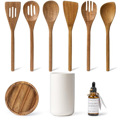 Quality and Materials: The Kitchen Utensil Set is crafted from premium natural teak hardwood, renowned for its durability and beauty. Teak wood is an excellent choice for kitchen utensils due to its resistance to moisture and warping. The handles are well-balanced, providing a comfortable grip that makes cooking a breeze. The ceramic holder is sturdy and aesthetically pleasing, adding a touch of sophistication to your countertop.